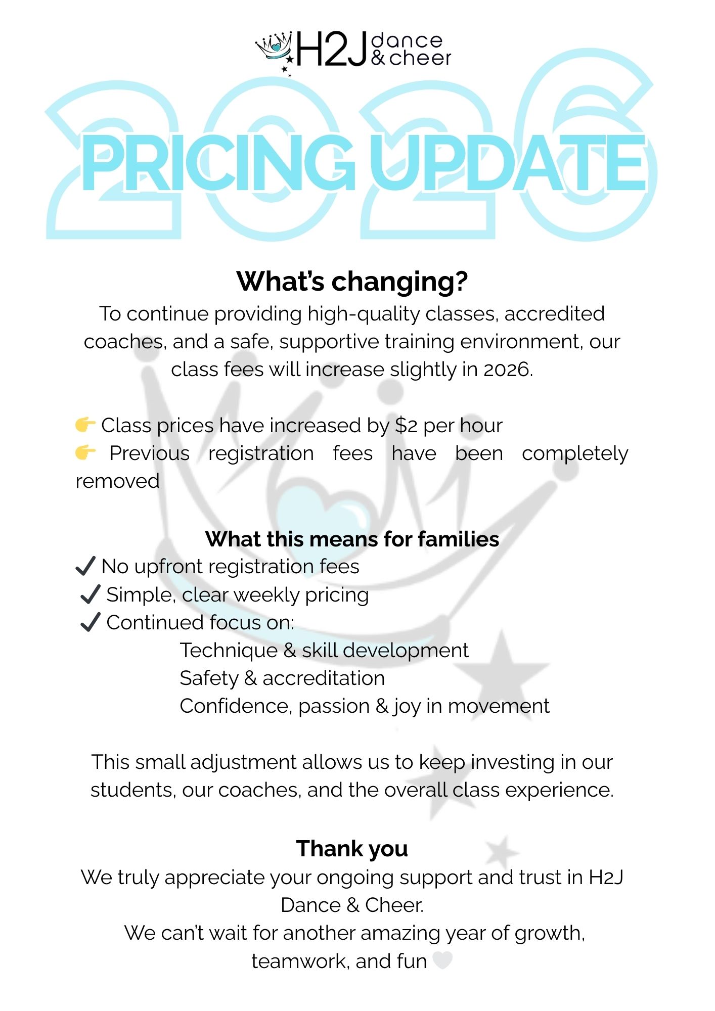 At H2J Dance & Cheer, we strive to provide high-quality training while keeping classes affordable for families. Below is an overview of our class pricing, payment policies, and requirements.